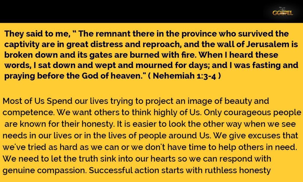 Most of Us Spend our lives trying to project an image of beauty and competence. We want others to think highly of Us. Only courageous people are known for their honesty. It is easier to look the other way when we see needs in our lives or in the lives of people around Us. We give excuses that we’ve tried as hard as we can or we don’t have time to help others in need. We need to let the truth sink into our hearts so we can respond with genuine compassion. Successful action starts with ruthless honesty.